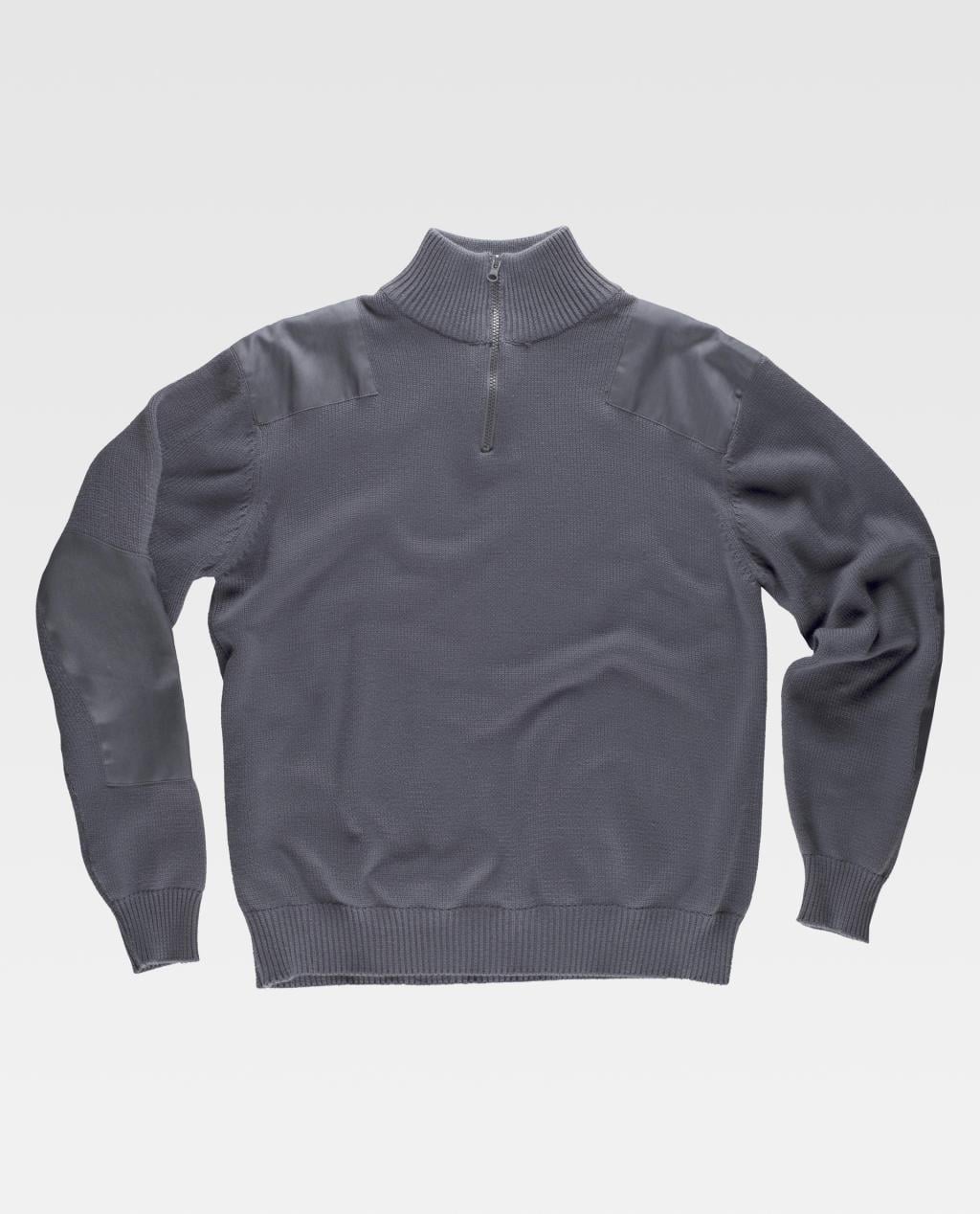 Jersey de cuello alto en punto grueso. Cierre de media cremallera de nylon. Refuerzos de sarga al tono en hombros y codos. Cuello, puños y cintura elásticos en punto canalé. Corte sport.