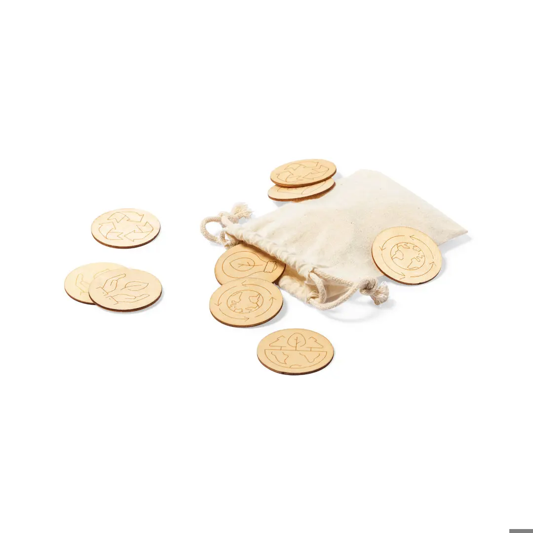 Juego de concienciación ecológica fabricado en madera. Set de 24 piezas en bolsa de transporte 100% algodón con cordones de cierre a juego.