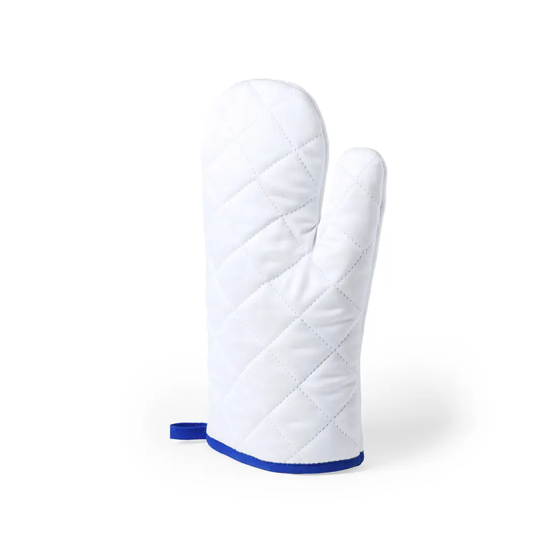 Manopla de cocina en suave material 100% poliéster de suave acabado en color blanco y con bordes en vivos colores. Con una cara lisa especialmente diseñada para sublimación y cinta para colgar.