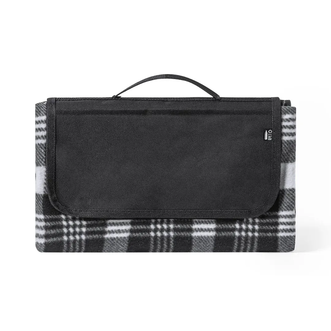 Manta de picnic de calidad premium, fabricada en poliéster RPET de 160g/m2, elaborado a partir de plástico reciclado para así fomentar la reutilización de residuos plásticos y contribuir a la sostenibilidad del planeta. Medidas 120x150cm, con lado para sentarse en patrón tartán bicolor de suave tacto. Lado en contacto con el suelo en resistente PEVA. De fácil plegado y de tamaño compacto, incluye asa de transporte y solapa con cierre de velcro, con distintivo RPET en etiqueta.