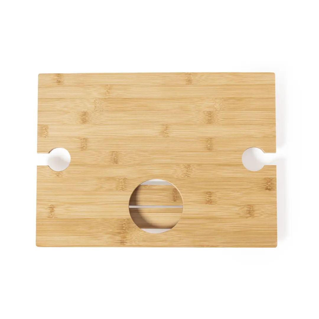 Mesa plegable para los aficionados al mundo del vino. Fabricada en bambú, incluye compartimento para botella de 75cl y 2 soportes para copa. De fácil plegado y tamaño compacto, presentada en atractiva caja individual de diseño eco.
