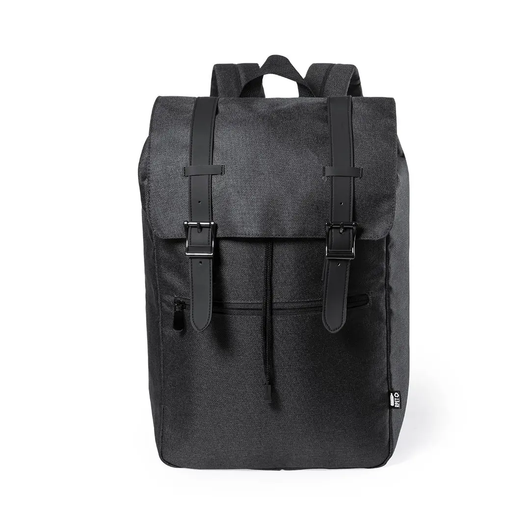 Mochila urban de línea nature, fabricada en resistente poliéster 300D RPET libre de PVC, elaborado a partir de plástico reciclado, para así fomentar la reutilización de residuos plásticos y contribuir a la sostenibilidad del planeta. Bolsillo principal con tiras y cierres de hebilla metálicos. con bolsillo frontal de cremallera y tirador metálico. Interior con bolsillo acolchado para portátil de hasta 15 pulgadas y tablet de hasta 10 pulgadas. Cintas ajustables para hombro acolchadas, con distintivo RPET en etiqueta exterior.