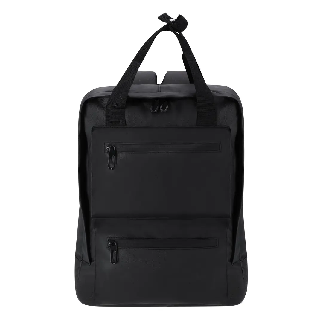 Mochila en resistente PU. Cuenta con un bolsillo principal y dos frontales para un acceso rápido. Cierres de cremallera invisible. Incluye dos bolsillos en los laterales y asas dobles de transporte, reforzadas en la parte superior con cinta de unión entre ellas para un fácil transporte. Equipada con bolsillo acolchado interior para portátil de hasta 15 pulgadas y bolsillo para tablet de hasta 10 pulgadas. Espalda y cintas de hombros acolchadas, transpirables y ajustables.