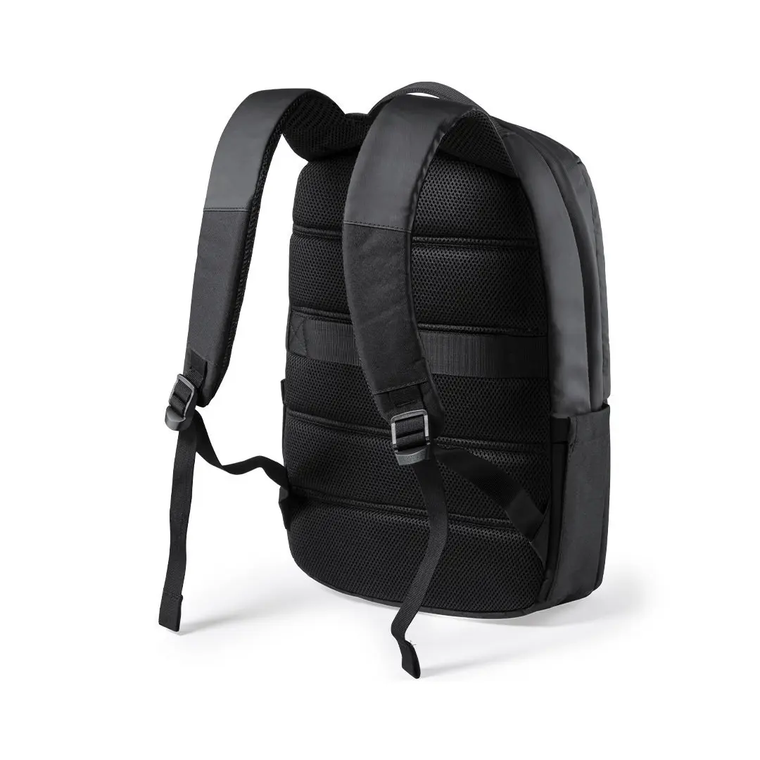 Mochila de Antonio Miró de calidad premium en resistente poliéster 600D de sobrio diseño en color negro. Con cierre de cremallera, bolsillo frontal y asa reforzada metálica. Con acolchado ergonómico en espalda y cintas de hombros, incluye compartimento interior acolchado para portátil de hasta 15 pulgadas y para tablets de hasta 10 pulgadas. Fundas interiores para bolígrafos y smartphone. Con logotipo de la marca en frontal.