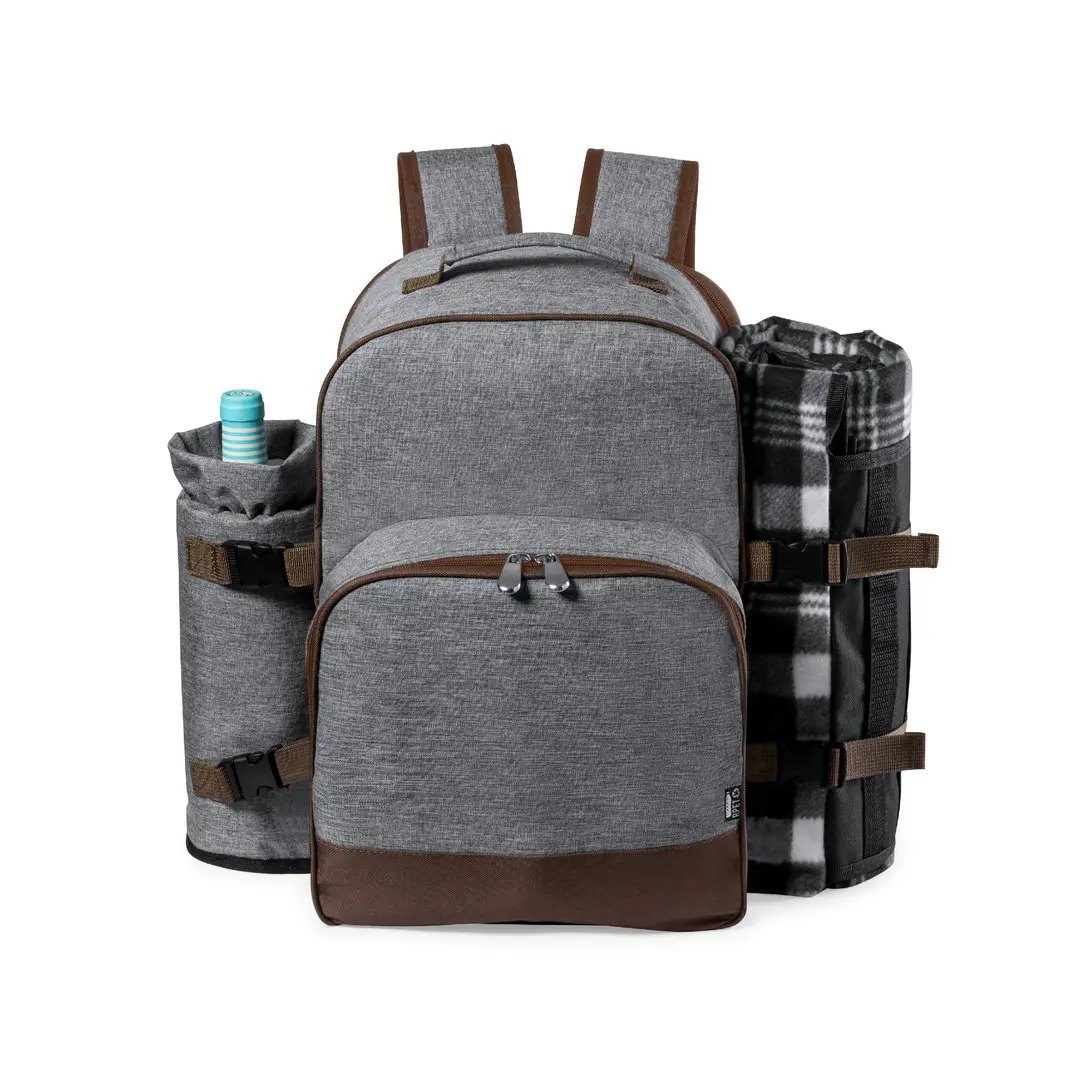 Mochila nevera para picnic de 4 servicios y con multitud de complementos, fabricada en resistente 600D RPET. Acabado en color gris, con detalles en marrón; asa de transporte y cintas para hombros acolchadas y ajustables. Compartimento principal con cierre de cremallera y tiradores metálicos. Interior isotermo en PEVA y etiqueta exterior con distintivo RPET. Incluye: 4 tazas en acero inox. 4 cucharas, 4 cuchillos y 4 tenedores en acero inox con mango en PP blanco. 1 cuchillo de untar en acero inox con mango en PP blanco 4 platos en PP blanco de 23 cm de diámetro. 4 servilletas en tela de 30 x 30 cm. Con diseño retro en patrón a cuadros y en combinación tonos negros, grises y blancos. Sacacorchos abridor en acero inox con mango en PP blanco. Salero y pimentero transparentes con tapón en PP blanco. Tabla de corte y presentación en madera, tamaño 15x15 cm. Bolsa plegable interior. Botellero térmico a juego en lateral izquierdo, fabricado en RPET y extraíble mediante cierres de hebilla. Manta de picnic de calidad premium lateral derecho, con cierres ajustables de hebilla. Medidas 120x150cm, con lado para sentarse en patrón tartán bicolor de agradable tacto. Base aislante en resistente PEVA. De fácil plegado y de tamaño compacto, incluye asa de transporte y solapa con cierre de velcro. El material RPET se elabora a partir de plástico reciclado, para así fomentar la reutilización de residuos plásticos y ayudar a la sostenibilidad del planeta.