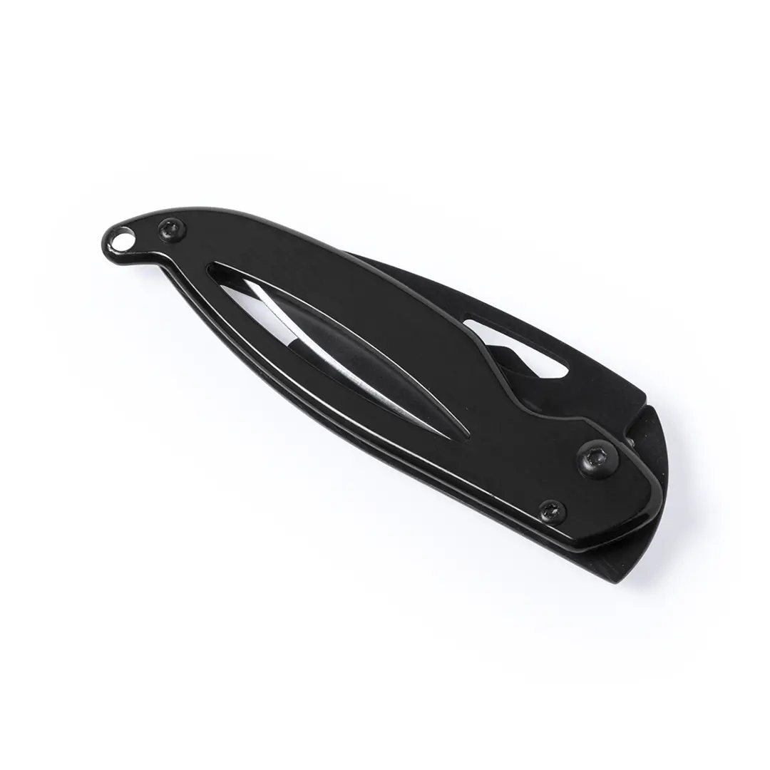 Navaja de alta calidad con hoja en acero inox de color oscuro y empuñadura en acero inox troquelada con bloqueo de seguridad. En variada gama de vivos colores y presentada en caja individual.