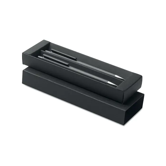Set de bolígrafo de aluminio reciclado con 1 bolígrafo de pulsador y 1 bolígrafo de grafito sin tinta. Tinta azul. Presentado en caja de papel reciclado.