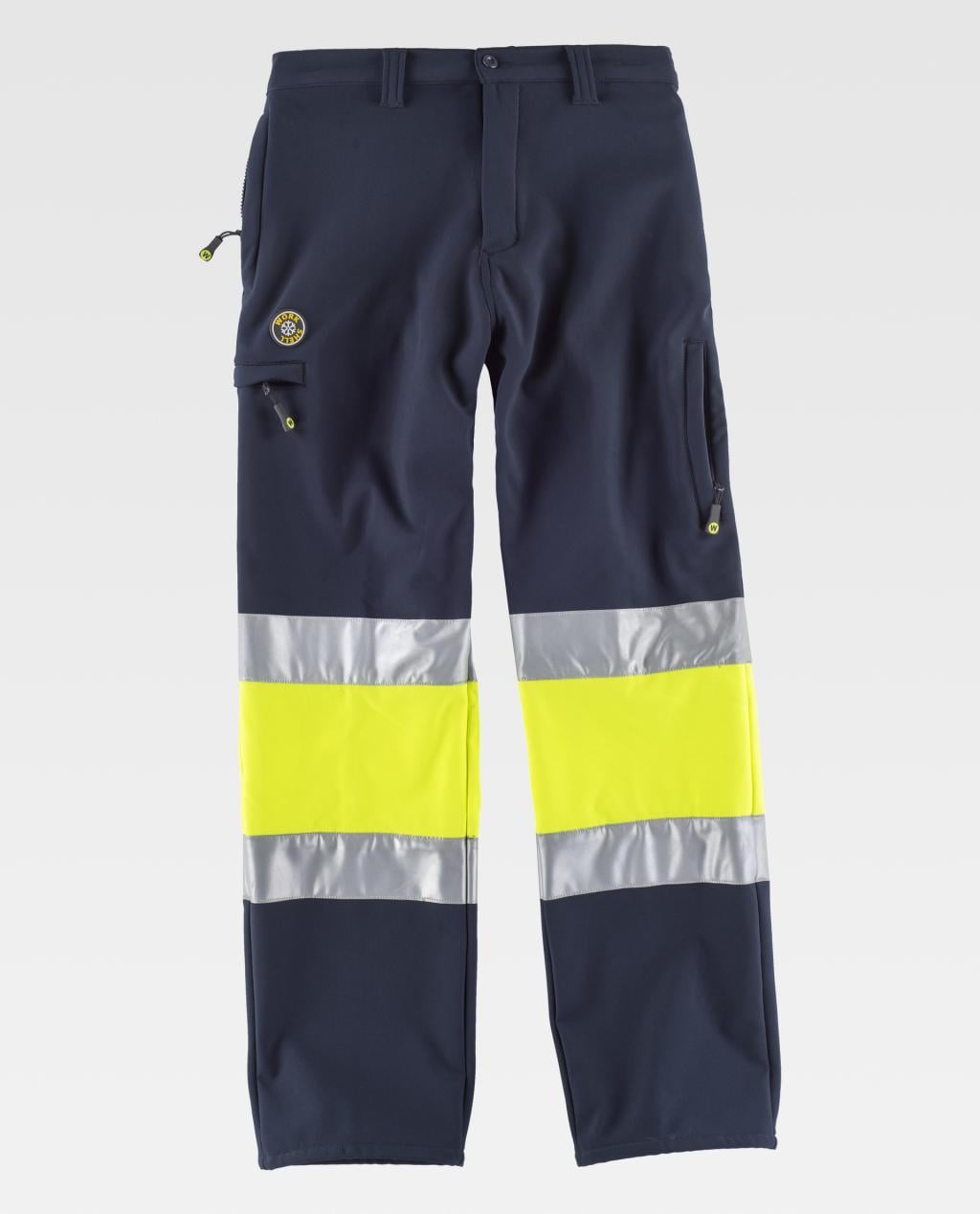 Pantalón Workshell combinado con alta visibilidad y cintas reflectantes. Dos bolsos de abertura vertical en los costados y dos bolsos laterales, todos interiores con cierre de cremallera. Dos bolsos traseros interiores con cremallera. Dos cintas reflectantes en perneras con pieza central de alta visibilidad. Elástico en la cintura. Trabillas. Cierre de botón y bragueta de cremallera. Tejido corta vientos, repelente al agua y resistente al desgarro con membrana interior transpirable y aislante e interior de alta capacidad térmica.