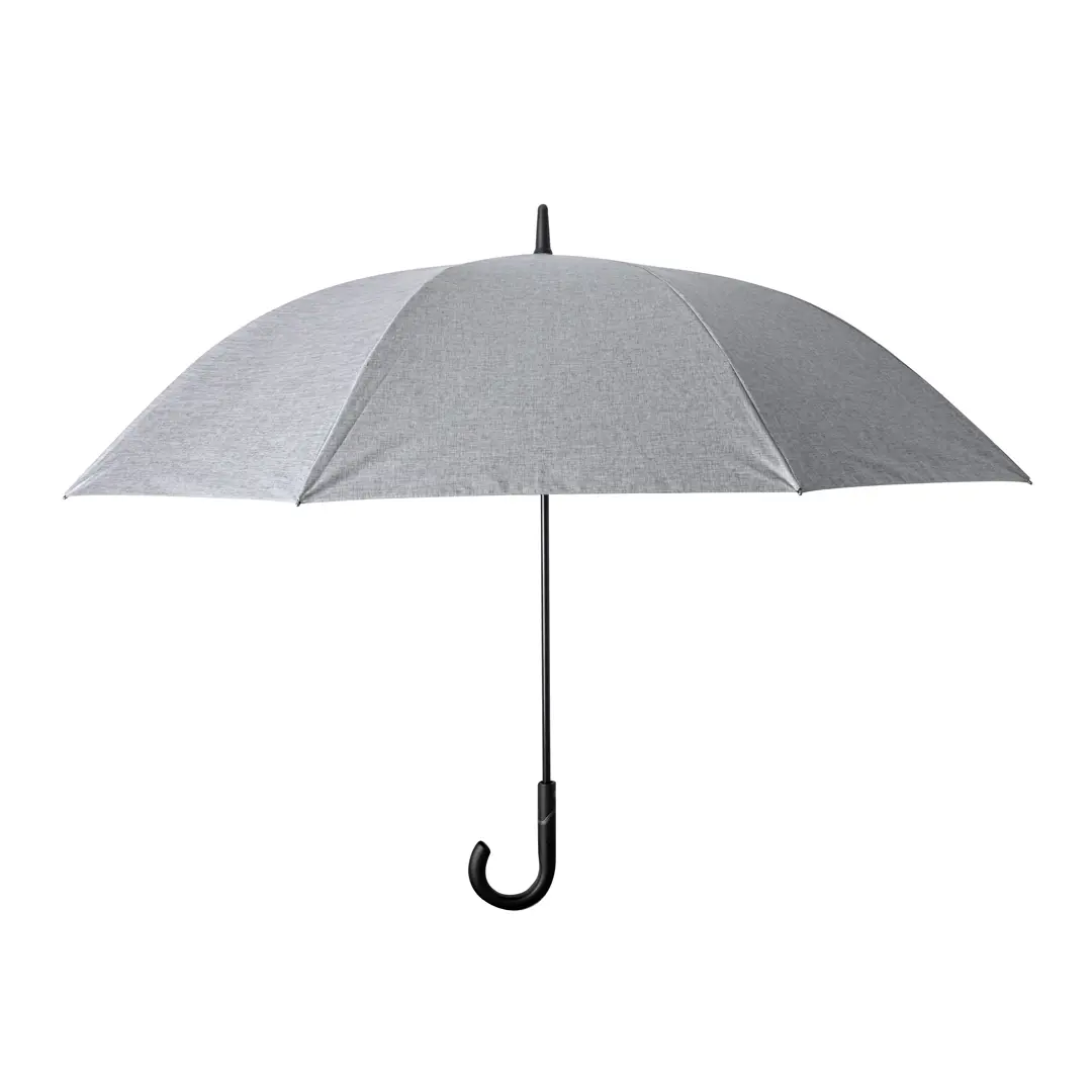 Paraguas de alta calidad y 130cm de diámetro, fabricado en material poliéster 150D y en elegante tono gris jaspeado. Apertura automática y varillas de fibra de vidrio, con sistema antiviento y cierre de velcro. Con mango ergonómico en suave ABS y presentado en bolsa reciclada.