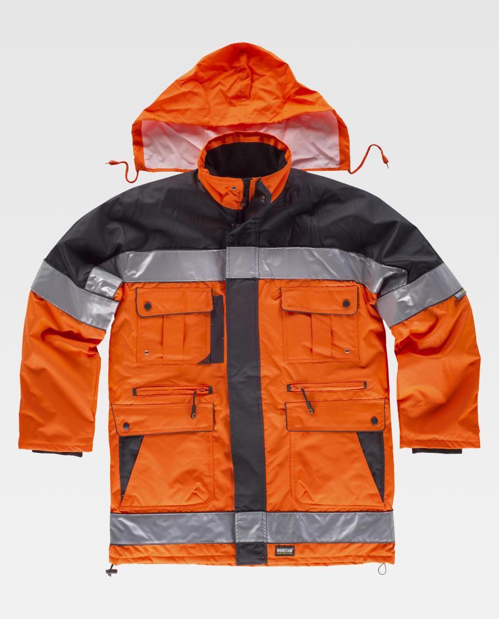 Parka acolchada combinada en tejido Oxford con cintas reflectantes. Canesús y cuello alto con capucha interior ajustable con cordón. Cierre de cremallera oculta por solapa postiza con corchetes. Dos bolsos de pecho de plastón con cartera de corchetes y bolsillo para bolis. Dos bolsos interiores con cierre de cremallera en los costados. Dobles bolsos de plastón de acceso superior y lateral con cartera de corchetes en los laterales. Un bolso trasero con cierre de cremallera. Un bolso de pecho con cierre de velcro y otro con cierre de cremallera en el interior. Una cinta reflectante en pecho, espalda, mangas y parte inferior. Puño elástico en el interior de la manga. Faldón ajustable en el interior de la cintura con cierre de corchetes. Bajo con cordón elástico ajustable. Vivos a contraste. Interior con tejido polar y forro acolchado.