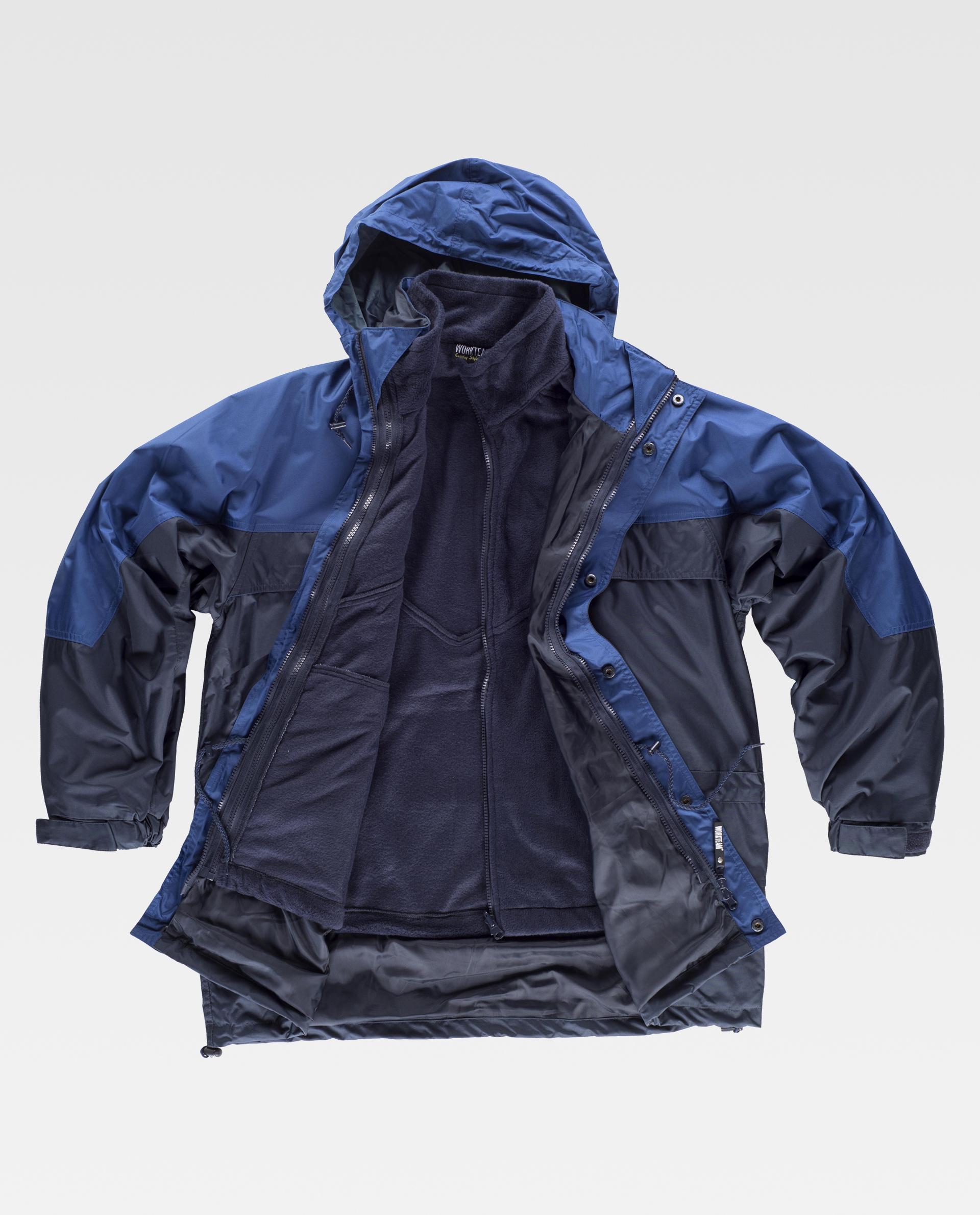 Parka con forro polar interior desmontable mediante cremalleras y corchetes. Exterior: Parka combinada de cuello alto con capucha desmontable con cordón elástico y pieza ajustable. Cierre de cremallera de nylon de dos tiradores oculta por doble solapa y cierre de corchetes. Dos bolsos de pecho y dos bolsos laterales solapados con cierre de cremallera. Canesús con pieza combinada en hombros que continúa en la manga. Puño con elástico y ajuste de velcro. Cordón interior en cintura y cordón elástico con pieza ajustable en bajo. Interior: Chaqueta polar de cuello alto y cierre de cremallera de nylon. Dos bolsos laterales con cierre de cremallera. Bocamanga con bies elástico. Cortes decorativos. Cordón elástico con pieza ajustable en bajo. Parka con forro polar interior desmontable mediante cremalleras y corchetes.