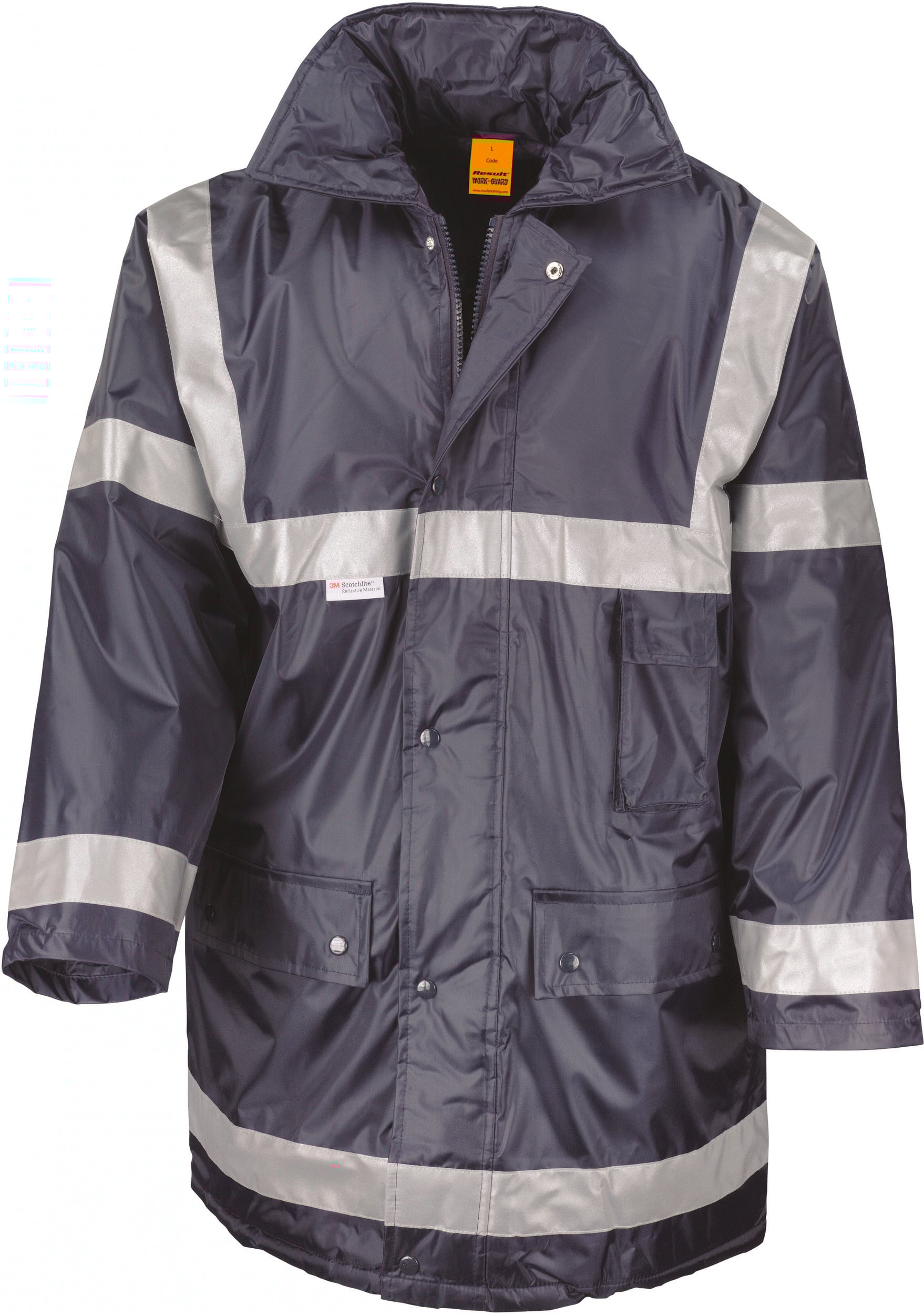 190T poliéster StormDri con revestimiento de PVC. Aislamiento de 140 g/m². Forro de poliéster 190T acolchado en rombos. Impermeable 1600 mm y costuras termoselladas. Capucha en el cuello. Forro acolchado. Solapa de protección con cierre de botones a presión. Bandas de seguridad de 50 mm cosidas. 2 bolsillos delanteros con cierre a presión, 1 bolsillo exterior para el móvil y 1 bolsillo interior. Abertura en la espalda para la personalización.