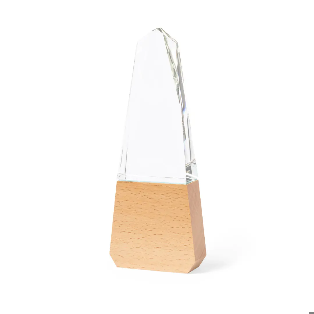 Placa conmemorativa fabricada en cristal grueso y resistente, con base en madera natural. Presentada en estuche de protección kraft, con cierre magnético y espuma interior.