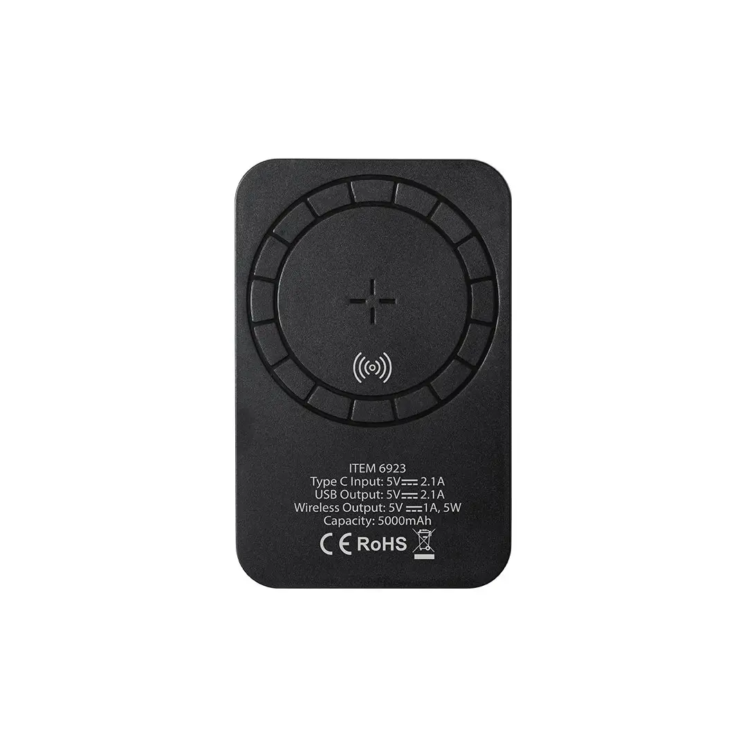 Batería auxiliar externa con tecnología de carga inalámbrica de gran capacidad -5.000 mAh-. De diseño compacto y con fijación magnética para poder usar el dispositivo mientras se produce la carga del mismo. Conexión Tipo-C de entrada de corriente y USB de salida, con cable de carga tipo C incluido. Botón ON/OFF, ledes indicadores de estado de carga y amplia superficie de marcaje. Presentada en atractiva caja de diseño, con manual de instrucciones en español e inglés. Incluye anillo adhesivo, siendo válido para todos los dispositivos con tecnología Magsafe y Qi. Las capacidades mostradas en todas nuestras baterías auxiliares externas son reales, incorporando todas ellas baterías de grado A y no recicladas, con una vida útil de al menos 500 ciclos de carga y según normativa CE. Además, están fabricadas conforme a los estándares RoHS y en cumplimiento con los siguientes requisitos de seguridad: Sistema de protección contra sobrecarga del power bank. Sistema de protección contra descarga completa que proporciona una mayor durabilidad del power bank. Sistema de bloqueo para evitar cortocircuitos. Sistema de transferencia de carga constante, acorde con la capacidad del dispositivo de destino.