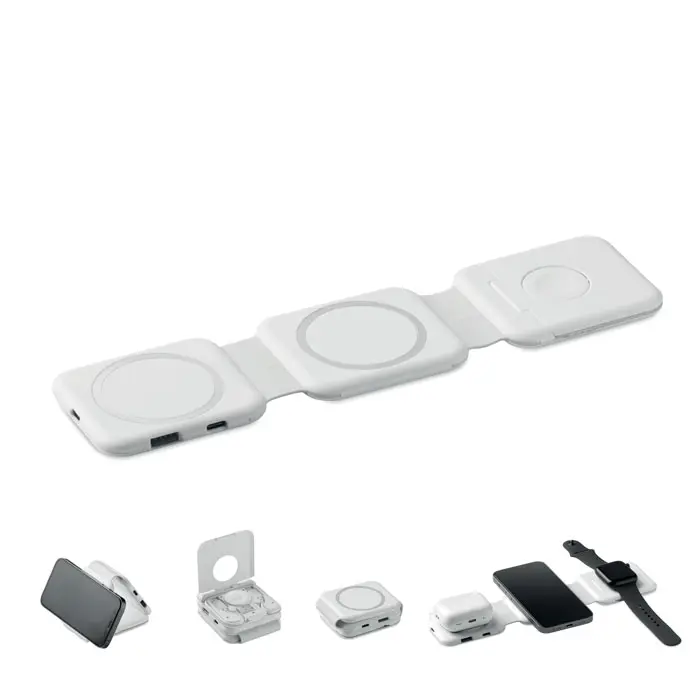 Base de carga magnética ABS. 3 puntos de carga inalámbrica. 1 x 15W, 1 x 5W para TWS y 1 cargador Apple watch (3W). 2 HUBS Tipo-C y 2 USB-A. Entrada de cable integrada: conector de Tipo-C a USB-A.
