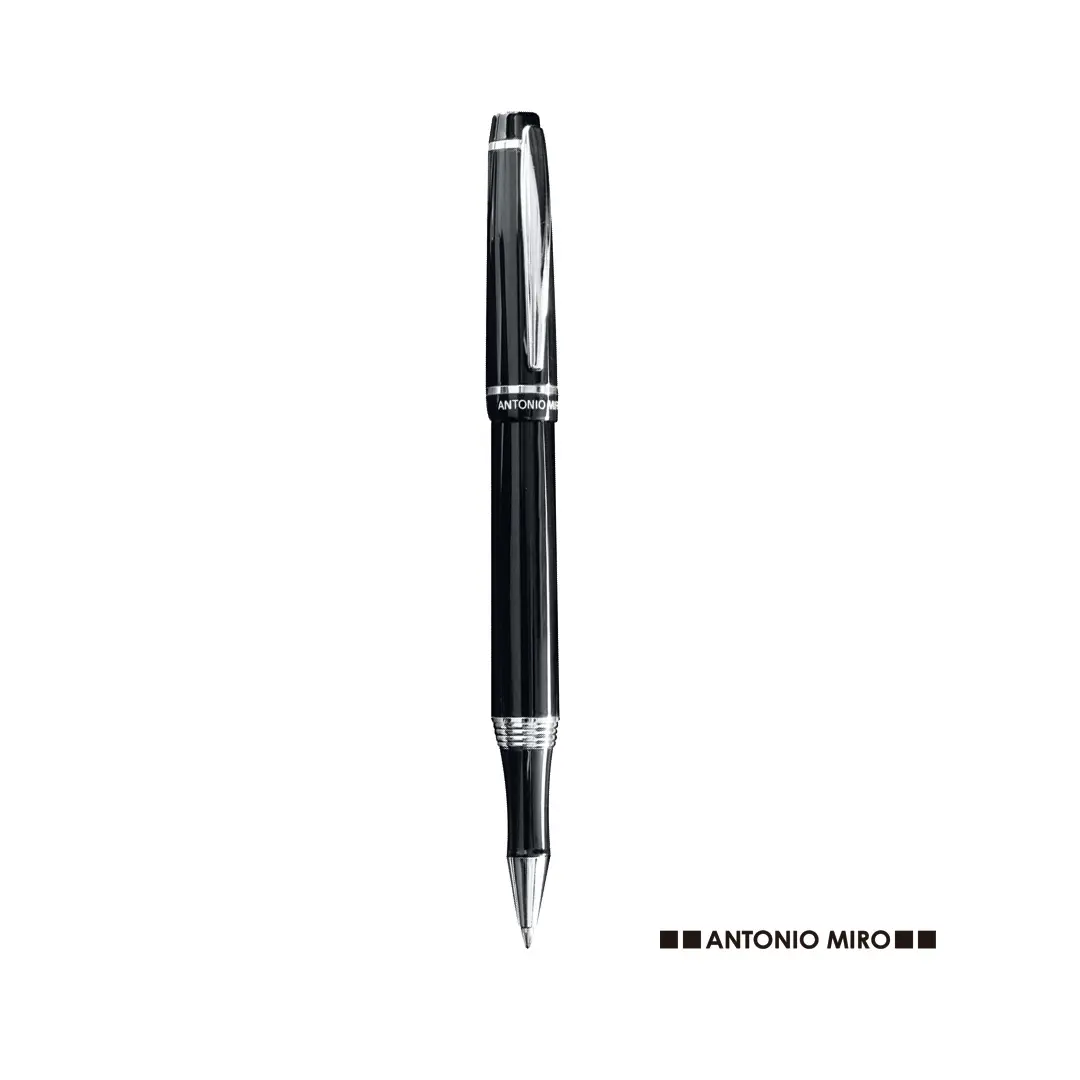 Roller de capucha de Antonio Miró en elegante diseño bicolor y suave cuerpo metálico en sobrio color negro. Con logotipo de la marca bajo la anilla, clip y punta en acabado plateado brillante. Presentado en estuche individual en color negro con logotipo de la marca. En tinta azul.