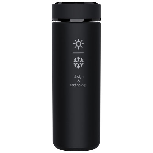 Botella de 500 ml de acero inoxidable con doble pared aislante y tratamiento antibacteriano y sensor de temperatura. Gracias al sistema «Touch & Light», la temperatura de la bebida se muestra en la tapa de la botella (en ° Celsius). Adecuado tanto para bebidas calientes como frías. Viene en una caja cilíndrica de regalo fabricada con papel reciclado. Tamaño: Ø 47 × 225 mm. Batería incluida: CR 2450 (3 V). La batería no puede sustituirse. Puede mostrar la temperatura 20 000 veces.
