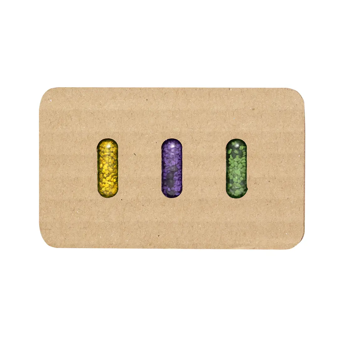Set de cápsulas con semillas presentado en estuche troquelado de cartón reciclado con instrucciones de plantado. Este kit de huerto contiene semillas de lavanda, hinojo y eneldo.