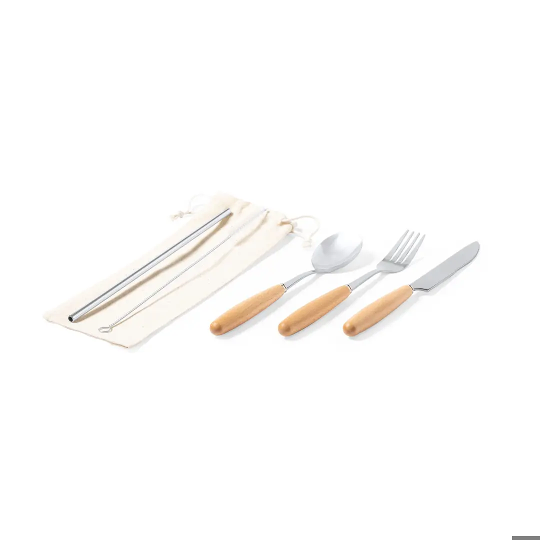 Set de cubiertos de 5 piezas fabricados en acero inox, con mango en madera natural. Incluye cuchara, tenedor, cuchillo, pajita reutilizable y cepillo limpiador para la pajita. Presentación en funda de algodón natural con cordón de cierre.