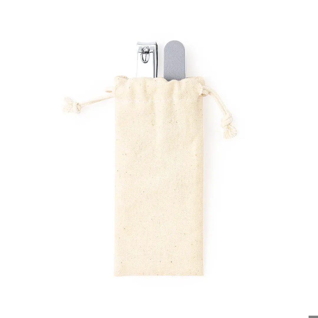 Set de manicura con cortauñas y lima. Presentado en bolsita individual con cordones de cierre en algodón crudo.