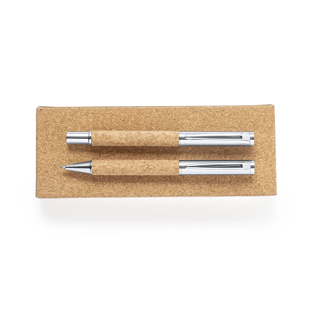 Set de bolígrafo y roller de línea nature. Fabricado en combinación de corcho natural con metal, para así fomentar la utilización de materias primas naturales y reducir las emisiones contaminantes. Bolígrafo de mecanismo giratorio en tinta azul. Roller con capucha y tinta gel en azul, con carga jumbo metalizada. Presentado en estuche individual de corcho con interior en antelina.