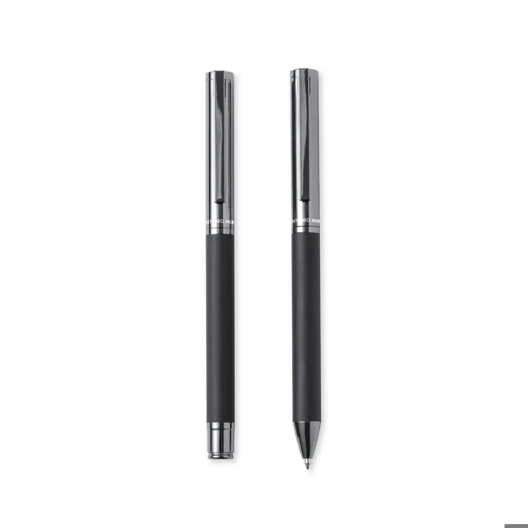 Set de bolígrafo y roller de Antonio Miró. Incluye: Bolígrafo metálico con cuerpo en negro mate. Detalles y capucha en cromado con logotipo de la marca; cartucho jumbo y en tinta azul. Roller metálico con cuerpo en negro mate. Detalles y capucha en cromado con logotipo de la marca. Cartucho jumbo y en tinta azul. Presentado en elegante y resistente estuche individual negro con logotipo Antonio Miró, cierre magnético y funda de protección a juego.