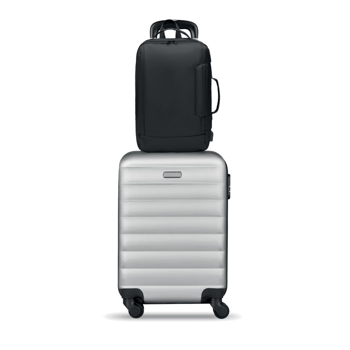 Mochila para portátil en poliéster RPET 300D con correa de hombro acolchada con asa y bolsillo lateral. Incluye un compartimento interno principal para un portátil de hasta 16' con conector USB tipo-A y cable para conectar tu powerbank (no incluido).