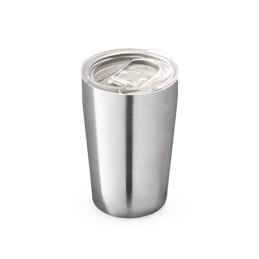 Vaso de viaje para sublimación de acero inoxidable de doble pared. Incluye una tapa transparente con apertura deslizante. Capacidad hasta 380ml. Suministrado en caja. ø77 x 120 mm