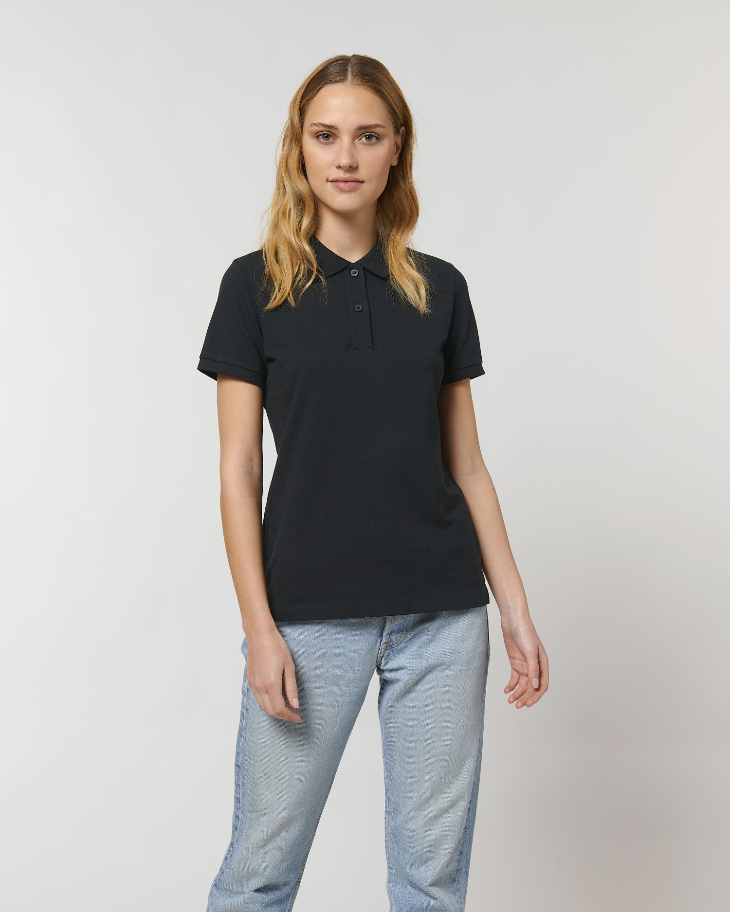 Polo de mujer. Corte entallado, Round Neck with Collar, Short Sleeve, Piqué. Manga montada Cuello y puños en punto elástico Cinta interior trasera del cuello en punto liso tupido Tapeta delantera con 2 botones del mismo color que el cuerpo Corte en las costuras laterales con refuerzo en punto liso tupido Pespunte sencillo en las costuras de los hombros Bajo con pespunte fino doble