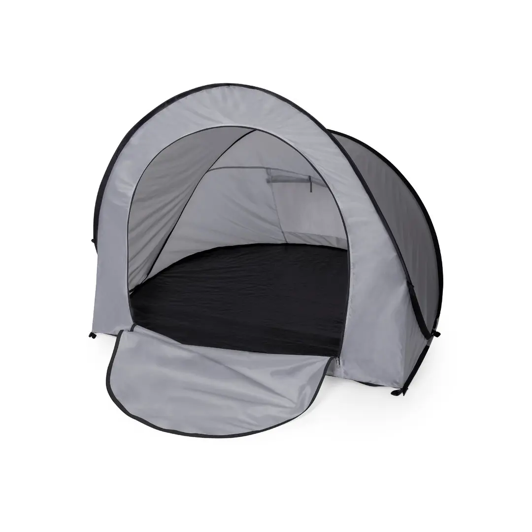 Tienda de campaña automontable, solo hay que sacarla de la funda y se despliega automáticamente. Fabricada en resistente poliéster RPET, con estructura metálica y detalles en color negro. Amplia puerta de entrada, con cierre de cremallera de doble tirador interior y exterior. Ventana en parte posterior con mosquitera, cierre de velcro y cortina enrollable con cordón y cinta de sujeción. Ideal para 2 personas y de fácil plegado. Presentada en funda a juego, con distintivo RPET en etiqueta exterior. El material RPET se elabora a partir de plástico reciclado, para así fomentar la reutilización de residuos plásticos y ayudar a la sostenibilidad del planeta.
