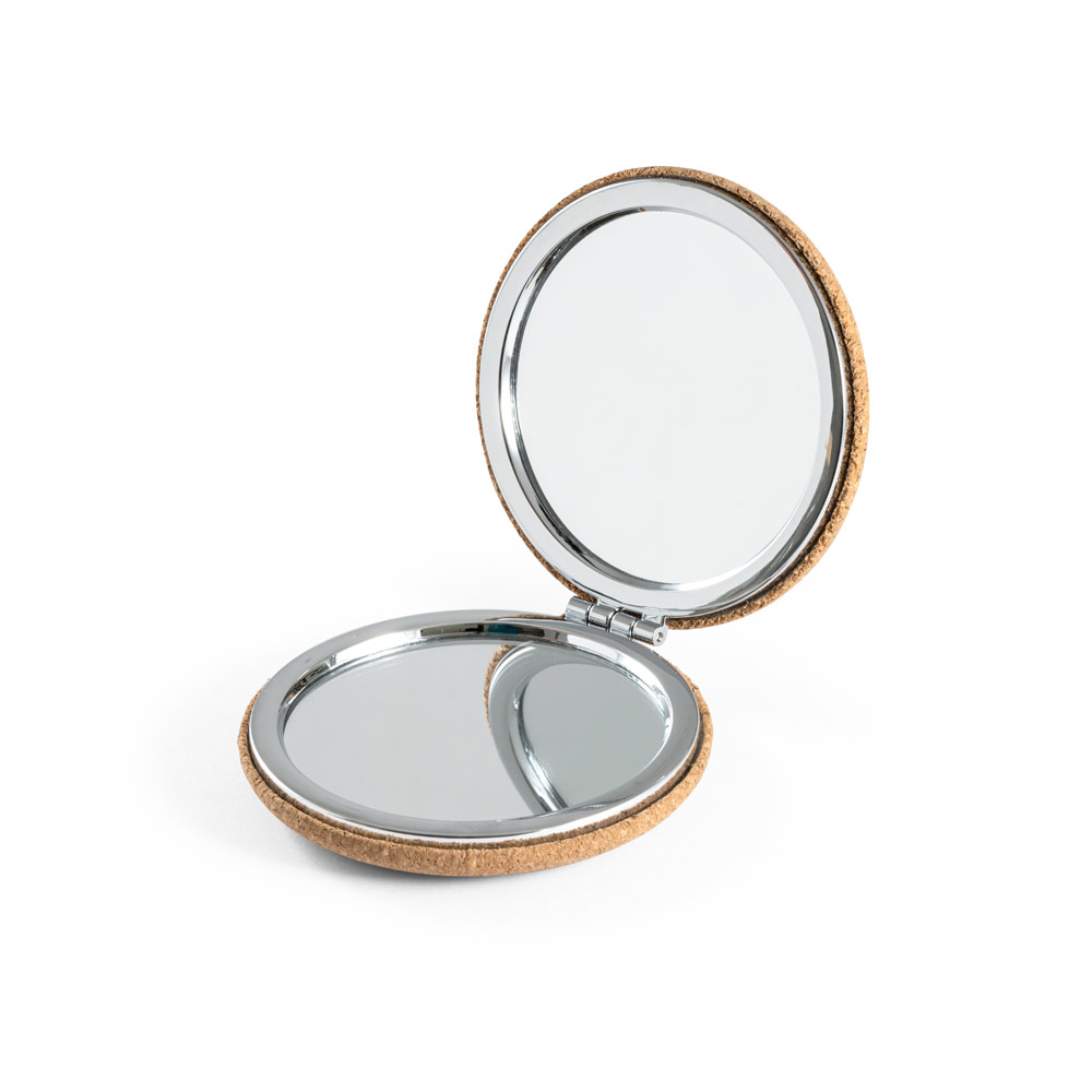 Espejo doble de corcho con cierre magnético. Se suministra en un estuche de papel natural. ø73 x 20 mm