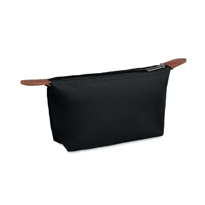 Neceser de poliéster RPET 600D con cierre superior de cremallera y detalle de PU marrón.