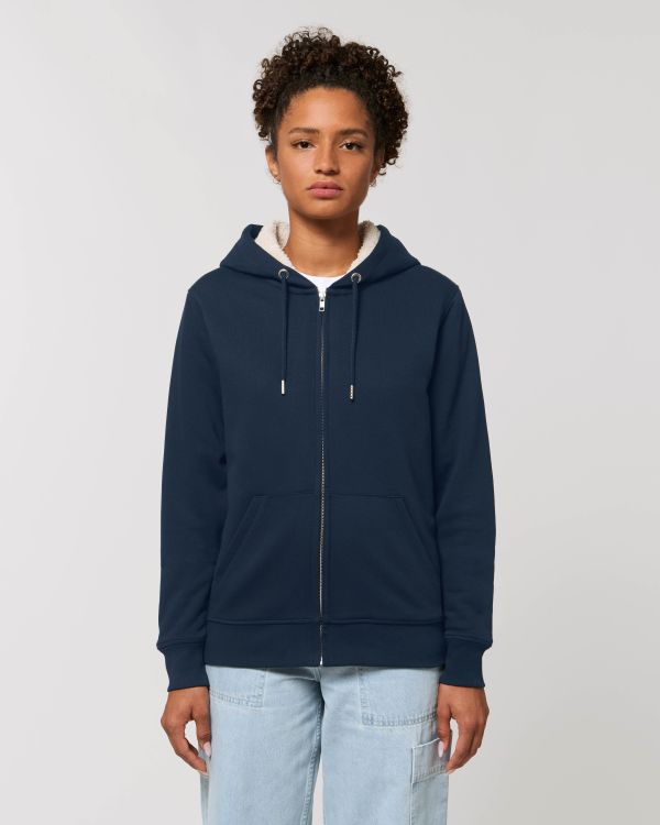 La chaqueta con capucha y cremallera, forro de borreguillo, unisex. Corte normal, Cuello redondo con capucha, Long Sleeve, Felpa no perchada. Manga pegada Capucha forrada con borreguillo reciclado Cordón redondo, en el mismo tono, rematado con extremos de acabado metálico Ojales metálicos Bies interior de espiga, color crudo, en el cuello Media luna interior en tejido principal Cremallera delantera, central, cubierta Canalé 1x1 en puños y bajo Pespunte en todas las costuras Bolsillo canguro Completamente forrado con borreguillo reciclado Bolsillo interior en el pecho Cremallera interior en el bajo para ajustar a medida