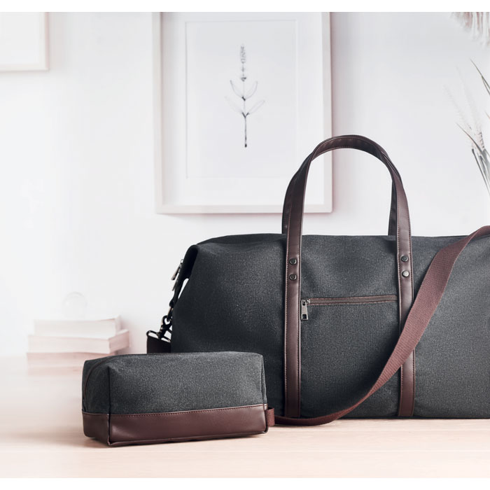 Bolsa de fin de semana en canvas lavada de alta calidad de 450 gr/m² con detalles en PU reciclado. El forro es de RPET 210D. Incluye correas resistentes, ajustables y desmontables. Tamaño perfecto como equipaje de mano.